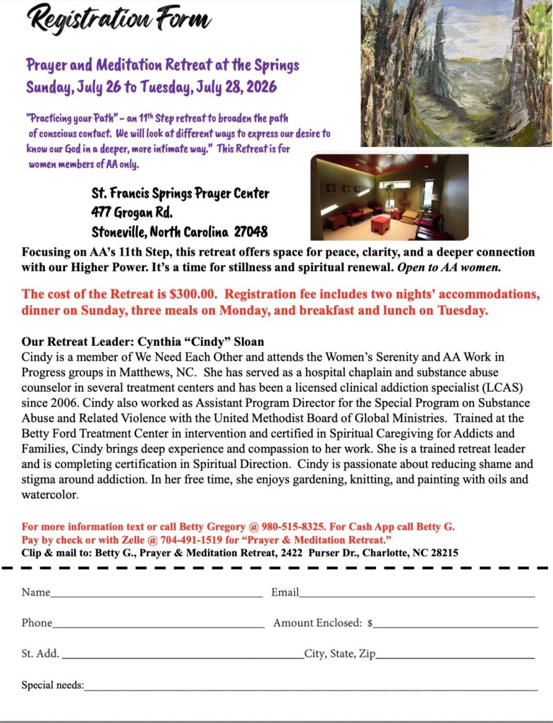 - 7 pm Serenity Sisters – Open Literature meeting for Women via Zoom https://us06web.zoom.us/j/89576557886?pwd=qH66UhspYyEi5cbJglD51CFyU6k9sB.1 Dial in: +1 (301)-715-8592 Meeting ID 895 7655 7886 Passcode: 4444